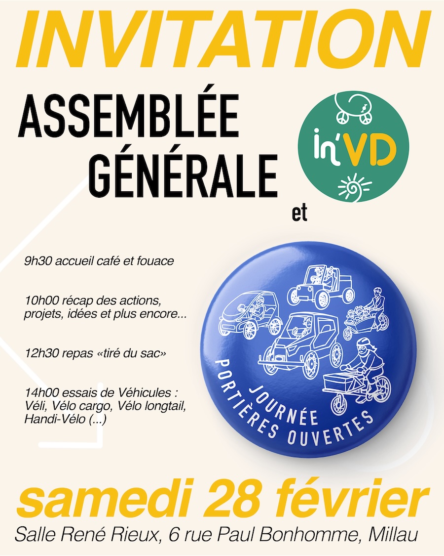 Read more: Journée Portières Ouvertes et Assemblée GénéraleIn’VD fait sa Journée Portières Ouvertes et Assemblée Générale. Tous les membres de l’association sont, par la présente, conviés à l’Assemblée Générale. 🗓️ samedi 28 février – 8h30 / 18h00📍Salle René Rieux, Cour du Créa – Millau🚨À l’essai : QBX Sorean, Citroen Ami, Kilow La Bagnole (à confirmer), Fun2Go, PetitPorteur, etc.