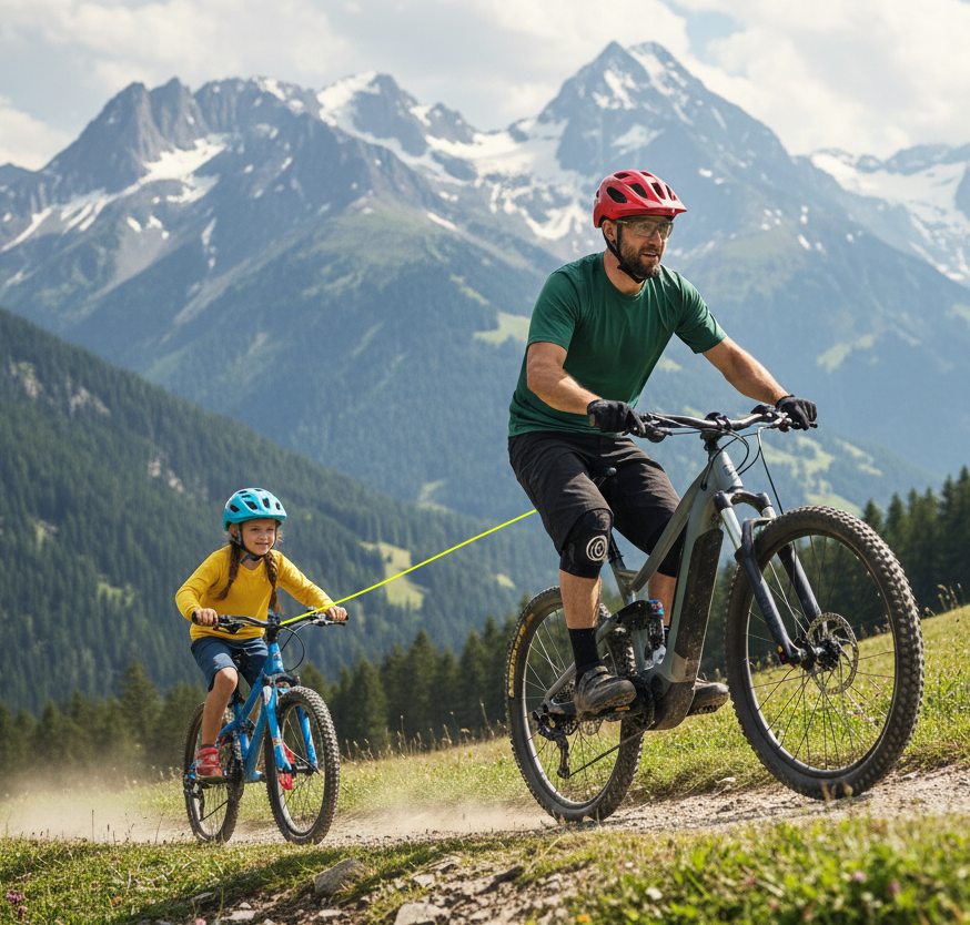 Le tire-vélo permet de tracter un vélo d’enfant pour l’aider lors de ses premiers tours de roues ou lors de montés difficiles. L’enfant et l’adulte garde leur pilotage et peuvent aller à l’encontre des bosses ou flaques.